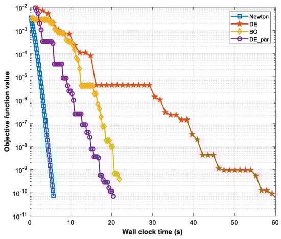 In recent decades, the performance of computers has experienced exponential growth due to the rapid development of semiconductor technology. To improve computational efficiency, parallel computing techniques have become a major approach. In this context, the DE algorithm is suitable for designing a parallel computing framework due to its individuals being independent of each other, with no coupling between them. As a result, the update and selection of individuals can be conducted in parallel. The results in Figure 4 include a comparison of the solution efficiency of Newton’s method, BO, DE, and DE_par (a parallel version of DE). The experiments were conducted using a six-core CPU to evaluate the performance of these methods.