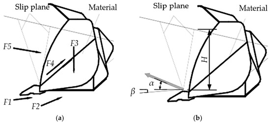 During the entire shoveling section, loaders experience five different forces. F1 represents the insertion force. F2 is the shovel force at the bucket bottom. F3 is the gravity of the materials being loaded. F4 accounts for the frictional forces between the loaded material and the inner wall of the bucket (including friction resulting from relative sliding and rolling). F5 corresponds to the sliding force on the slip surface [20], as illustrated in Figure 2a.