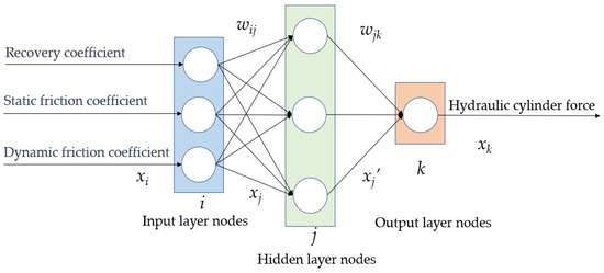The establishment of the BP neural network structure involves multiple sections, including data collection and preparation, selection of the network structure, model compilation, model training, and adjustment and optimization. Ultimately, the neural network structure is constructed, as described in Reference [22]. In the structure of BP NNLA, i represents the input layer nodes, j represents the hidden layer nodes, and k represents the output layer nodes. The input layer nodes include the recovery coefficient, the static friction coefficient, and the dynamic friction coefficient. The output layer nodes represent the force of the hydraulic cylinder force. The input layer consists of three parameters that undergo the influence of nodes in hidden layer nodes. A non-linear mapping relationship is established between the input layer nodes and the output layer nodes to predict the value of the hydraulic cylinder force. The model’s structure is illustrated in Figure 3.