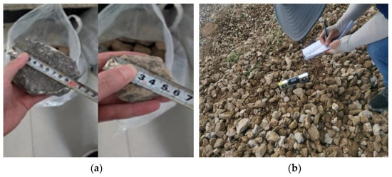 The experiments mainly consist of two parts: static and dynamic calibration experiments [23]. The static calibration experiment involves the measurement of the physical parameters of the loading material. The necessary measurement tools include an inclinometer and a tape measure. These tools are used to measure the on-site ore pile density, particle size, repose angle, and other parameters. The static calibration experiment is depicted in Figure 4.