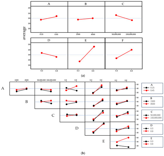 Factor diagram: (a) primary effect diagram of repose angle; (b) interaction diagram of repose angle.