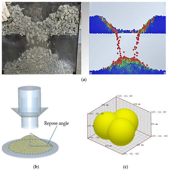 The simulation is performed by the DEM. The difficulty lies in defining the key parameters for the simulation. Accurate simulation of key parameters can be obtained through material calibration. To ensure the effectiveness of the simulation, it is necessary to control the error between the simulation’s results and the experimental results, keeping it within an acceptable range.