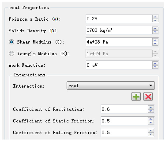 The calibration of physical parameters includes density calibration and repose-angle calibration. The density calibration process is illustrated in Figure 7a, which indicates that the actual repose density is first obtained through experiments. Subsequently, the particle density in EDEM is adjusted to match the measured density after settling [26]. The simulation process for repose-angle calibration is depicted in Figure 7b. Using the recovery coefficient, static friction coefficient, and dynamic friction coefficient as calibration factors, the three-factor, four-level, full factorial experimental design table is established, comprising 64 sets of experiments. The parameter set with the smallest deviation from the actual repose angle is chosen for the calibrated parameters. The final particle parameters are presented in Figure 8. In the EDEM simulation process, the particle shape used is depicted in Figure 7c. When using the triple sphere, the particle more closely resembles a real ore. The annotations in Figure 7c indicate the maximum values and midpoint values in each direction within the space occupied by the particle.