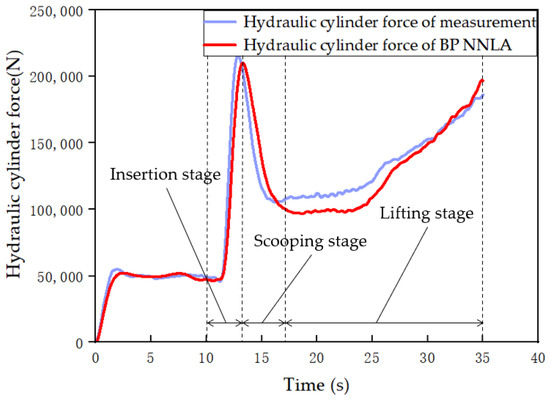 By adjusting the parameters of the bucket and the material interaction pile, the mechanical parameters are calibrated. The parameters that conform to the rules of hydraulic cylinder force are selected as the input layer nodes of the BP NNLA model [27]. Material parameters obtained from the calibration are imported to establish the material pile model. The three-factor and three-level full factorial calibration experimental design table is established. A combined simulation model is created. Measured cylinder-displacement curves and vehicle-speed variation curves are imported into the model. Hydraulic cylinder force curves are extracted. Using the BP NNLA, the curve that best matches the test hydraulic cylinder force curve is identified. The parameters corresponding to that curve are selected as the output layer. The final calibration results are obtained, as shown in Figure 9. The maximum point of hydraulic cylinder force occurs when the bucket is inserted into the material, and the hydraulic cylinder force reaches its peak when the shovel force of the bucket is at its maximum.