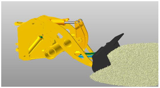 In Figure 2b, the α represents the angle between the movement direction of the EWL and the horizontal plane, the β is the angle between the horizontal direction and the cutting edge of the bucket, and the H is the height of the filled material. Based on geometric and kinematic relationships, the relationship between bucket shoveling volume and the trajectory of EWL can be derived [21]. Expressions for other forces can also be derived. The derivation section requires the use of numerical computations, which can introduce significant errors. The DEM can effectively solve these issues.