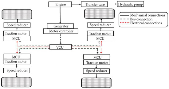 The five-motor system includes four wheel-driving motors and one independent hydraulic drive motor. Different control strategies are required for various operating conditions. In November 2020, the experimental EWL model was published at the Shanghai BMW Exhibition. The experimental EWL described in this paper is the only 35-ton EWL currently available. A distributed drive configuration consisting of an engine, generator, inverter, four electric motors, and reducers was adopted. The control types depicted include mechanical control, bus control, and electrical control; the power transmission path of the experimental EWL is illustrated in Figure 12.