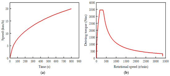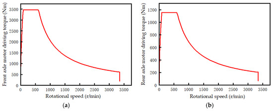 The simulation curves of the motor torque for the front and rear wheels of the full- load EWL during first-gear linear acceleration are depicted in Figure 14. The loaded condition involves simulating materials with a 35-ton block. According to the empirical data, when the EWL is no-load and accelerates in first gear, the torque for the front two wheels is the same, and the torque for the rear two wheels is also the same. Additionally, the torque for the front two wheels is greater than that for the rear two wheels. The torque for the front wheels constitutes approximately 70–75% of the total torque for all four wheels, while the torque for the rear wheels constitutes approximately 25–30%. Figure 14a shows the simulation curve of the torque variation for the front axle motor. When the EWL is no-load and accelerates in first gear, all four wheel torques are the same, as illustrated in Figure 14b, which presents the simulation curve of the torque variation for all four wheels during no-load acceleration.