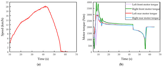 The torque curves for all four wheels during no-load first-gear linear acceleration are depicted in Figure 16b. From Figure 16b, it can be observed that the variation trend of the motor torque for all four wheels is essentially consistent during no-load driving. The maximum motor torque is around 3500 Nm, with the sum of the torque from the front two motors being roughly equal to the sum of the torque from the rear two motors. Each set constitutes approximately 50% of the total motor torque, demonstrating the rationality of the motor-power-matching method. This validates the applicability of the proposed method.