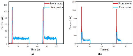 After calculating the torque and speed, the power of the driving motor is obtained. The power curves of the two motors are shown in Figure 17. Under no-load conditions, the maximum power for front- and rear-wheel acceleration is 112.7 kW. Under full-load conditions, the maximum power for front-wheel acceleration is 211.4 kW, and for the rear wheel, the maximum power for front-wheel acceleration is 72.1 kW. The results indicate that the power data for the front and rear motors are close, with an overall deviation of less than 2%. Power matching and control meet the practical loading requirements.