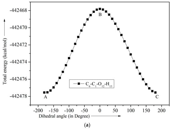 (a–c). Variation of the total energies with the dihedral angles for the rotations of the OH groups about their respective axes.