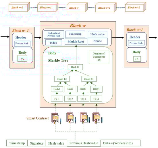 In the process of blockchain mining, miners use a random value called a nonce to fulfill specific criteria in the consensus algorithm, thereby enhancing network security and resource requirements []. The Merkle root ensures transaction integrity through cryptographic hashing and creates a hierarchical structure called a Merkle tree []. A block’s body contains validated transactions, which can vary based on the application; for construction workers’ information management, these transactions might include registration, updates, access permissions, verification, authentication, and termination. These transactions are stored within the block and are extremely difficult to modify due to blockchain’s immutability, thus ensuring data integrity and security [].