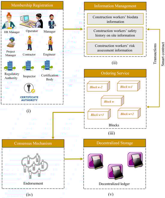 In this architecture, the biodata and safety data of the tilers are stored in a decentralized manner on the blockchain network. Each worker’s information is encrypted and stored in blocks, thus forming an immutable and tamper-proof ledger. Data encryption aids in preventing unauthorized users from accessing data stored within a blockchain network and its data storage system []. Access to the data is strictly controlled through cryptographic keys, thus ensuring confidentiality and privacy. Unlike traditional centralized systems, where a single point of failure can compromise the privacy of workers, the distributed nature of the proposed blockchain provided an added layer of protection against data breaches and unauthorized access and allowed for real-time updates and synchronized data [] across all relevant stakeholders, including employers, regulatory bodies, and project managers. Smart contracts or chaincodes are implemented to automate key processes related to construction workers’ management, such as verifying trade type or skills, certifications, high-risk-level workers, and tracking training programs.