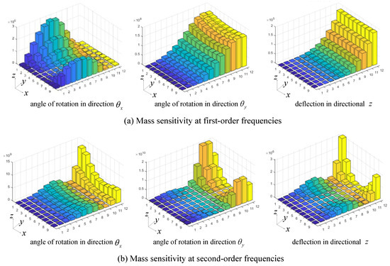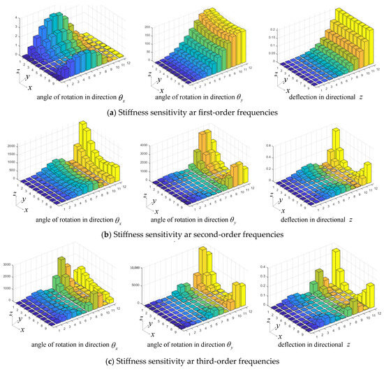 Using the method outlined in Section 2.2 for calculating the first-order sensitivity of thin-walled blades while referring to the literature [1], the overall stiffness matrix (K) and mass matrix (M) of the thin-walled blade surface are computed through programming in the Matlab environment. Upon substitution into Equations (27) and (29), the eigenvalue-to-stiffness sensitivity depicted in Figure 3 and the eigenvalue-to-mass sensitivity shown in Figure 4 are obtained through programming calculations, respectively. The x–y axes in the horizontal plane represent the grid node divisions and the vertical plane axis z represents the sensitivity amplitude. Technical abbreviations are defined upon their first use.