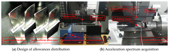 To ensure the proposed method’s reliability in the finishing stage, a traditional uniform allowance distribution structure design was shown as A and B in Figure 8a, alongside the non-uniform allowance structure design shown as C and Din Figure 8a, with a guarantee of the same amount of removal volume. The vibration acceleration spectrum acquired during cutting is shown in Figure 8b. The experiments were conducted using a VMP-850A four-axis vertical machining center equipped with a BT40 spindle and toolholder, a carbide ball end milling cutter with a diameter of 8 mm and a tool overhang of L = 30 mm. The axial depth of cut was ap = 0.2 mm, and the cutting speed was f = 1100 mm/min with a milling mode of down milling and a blade material of TC4 titanium alloy. The blade basin milling process is shown in Figure 8c.The blade suction milling process is shown in Figure 8d.The cutting tool was cooled with emulsion.