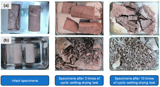 Red-bed soft rock (RBSR) displays poor mechanical properties, and especially terrible deterioration when exposed to water. This susceptibility to disintegration was evaluated using drying–wetting cycles experiments conducted in accordance with ASTM D4373-14 [33]. In accordance with the Chinese standard for assessing the physical and mechanical properties of rock (DZ/T 0276.9-2015) [34], cylindrical specimens of 50 mm diameter and 100 mm (±1 mm) height, and weighing 0.39–0.41 kg, were used. Two representative RBSR kinds, (a) argillaceous sandstone and (b) silty mudstone, were selected for the wetting–drying cycle testing. Figure 1 shows the results of disintegration experiments. Specimens disintegrated after three cycles, and complete disintegration was observed after ten cycles. This evidence confirms the substantial degradation of the parameters of the RBSR mass in tunnels in water infiltration conditions, which is of paramount concern during tunnel operation. Therefore, the establishment of a numerical tunnel modeling framework for the purpose of obtaining parameter samples and subsequently deducing rock mechanics properties has considerable practical utility.