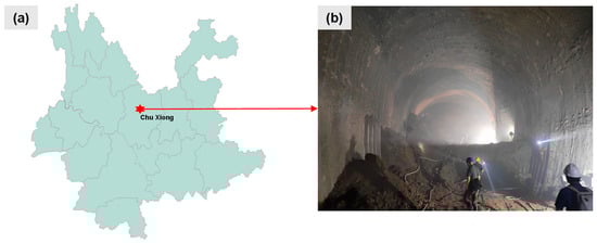 Location of CYWDP. (a) Location of Chuxiong in Yunnan province; (b) condition of the work face in the RBSR tunnel.