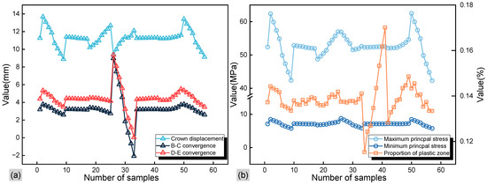 For the crown displacement, the four most sensitive factors in descending order are burial depth, saturation density, elastic modulus, and Poisson ratio. In terms of the B–C/D–E convergence, the four factors with the highest sensitivity indices are Poisson ratio, cohesion, internal friction angle, and burial depth. Regarding the maximum/minimum principal stresses, the four most sensitive factors are burial depth, saturation density, elastic modulus, and Poisson ratio. As for the proportion of the plastic zone, the four factors with the highest sensitivity indices are cohesion, internal friction angle, burial depth, and Poisson ratio. From the perspective of factors with minimal influence, various output models consistently exhibit factors of relative insignificance. For instance, external hydrostatic pressure and Poisson ratio have a negligible effect on the evolution of plastic zones, and the internal friction angle has a minimal impact on the settlement of arch crowns.