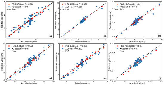 Regression prediction performance of PSO-XGBoost and XGBoost. (a) Crown displacement; (b) B–C convergence; (c) D–E convergence; (d) maximum principal stress; (e) minimum principal stress; (f) proportion of plastic zone.
