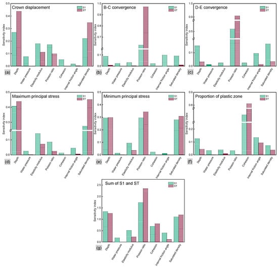 S1 and ST of seven factors. (a) Crown displacement; (b) B–C convergence; (c) D–E convergence; (d) maximum principal stress; (e) minimum principal stress; (f) proportion of plastic zone; (g) sum of S1 and ST.