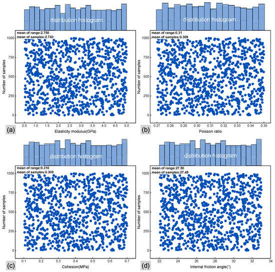 In this study, we employed the Latin Hypercube Sampling (LHS) method to generate a set of 1000 samples within the range of parameters [44,45]. Figure 8 illustrates the distribution of samples, demonstrating a comprehensive coverage within the defined range. Moreover, the average values of the 1000 samples for each parameter were close to the specified range’s mean values (elasticity modulus: 2.743 GPa, Poisson ratio: 0.31, cohesion: 0.4 MPa, and internal friction angle: 27.5°). Consequently, it is evident that the outcomes of this sampling method can serve as a foundation for the establishment of a metamodel.