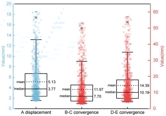 Subsequently, we brought the inversed parameters into the FEM calculation to obtain the simulated values when tunnel operation became stable. A comparative analysis was performed between computed results and actual monitoring data. Figure 11 illustrates the error range of the monitoring data variation (15%). Figure 11a indicates an average error of 9.52% between the monitoring data and the computed results in crown displacement. Similarly, discrepancies of 6.28% and 8.68% in B–C convergence and D–E convergence exist, as shown in Figure 11b,c are within the project’s allowable error range [46]. The full results revealed an acceptable error interval, as was specified in the engineering scale. The findings further indicated that the parameter inversion model based on the PSO-XGBoost algorithm demonstrates a commendable level of reliability, and can also serve as a valuable reference for the recognition of surrounding rock mass properties under tunnel operation.