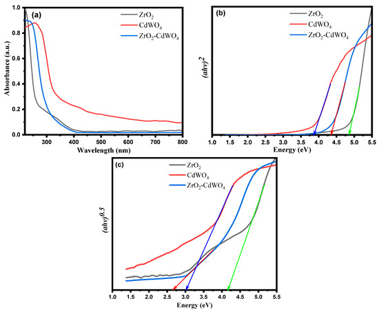 (a) UV–Visible diffuse absorbance spectrum of (a) ZrO2, CdWO4, ZrO2-CdWO4; (b) a Tauc plot of ZrO2, CdWO4, and ZrO2-CdWO4 as an indirect band gap; and (c) a Tauc plot of ZrO2, CdWO4, and ZrO2-CdWO4 as a direct band gap.