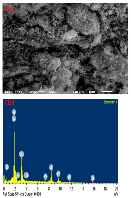 (a) SEM images and (b) EDX of ZrO2-CdWO4 NC.