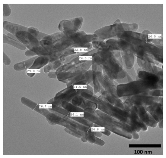 The particle size, pattern, morphology, and distribution of crystallite were confirmed by transmission electron microscopy. TEM images of the biogenically synthesized ZrO2-CdWO4 NC at 400 °C of calcination are given in Figure 5. The presence of ZrO2 on the rod-shaped CdWO4 nanorods increases the roughness. Further, the particles were well crystallized without defects and self-aggregated. Self-aggregation is caused by the high generation rate of CdWO4 nanorods. Due to fewer electron density differences between the particles, the ZrO2 particles and CdWO4 nanorods appeared to be slightly different in color. The particle size diameter is nearly 16–30 nm. The nanorods CdWO4 in NC can also be verified from the TEM images of previously reported CdWO4-based NCs such as ZnO-CdWO4, CuO-CdWO4, and CuO-ZnO-CdWO4.
