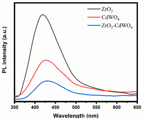 To elucidate the photogenerated charge carrier separation at the interface of ZrO2-CdWO4, photoluminescence (PL) spectra were analyzed. The PL spectrum shows the comparative e−-h+ recombination rate in the bare semiconductors and heterojunction [16]. Figure 7 shows the PL spectra of ZrO2 and CdWO4, and also the heterojunction (ZrO2-CdWO4). As can be seen in the PL spectra, the PL intensity was significantly reduced when the heterojunction was formed as compared to ZrO2 and CdWO4 [15,16]. The decrease in the PL intensity upon ZrO2 loading might be due to the decrease in the rate of e−-h+ recombination upon loading ZrO2 on CdWO4 [15,16]. Therefore, the heterojunction photocatalyst shows even better photolytic activity than the virgin ZrO2 and CdWO4.