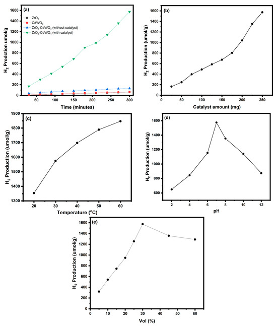 Optimization results of H2 production via water splitting using ZrO2-CdWO4: (a) time effect, (b) catalyst amount effect, (c) temperature effect, (d) pH effect, and (e) MeOH vol% effect.