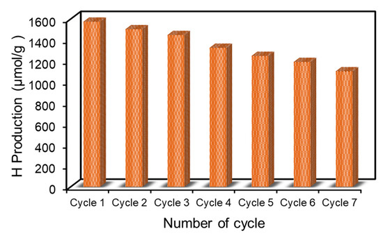 It is very important to assess the stability and life cycle of the photocatalyst for cheap and smooth production of H2 gas. In view of this, the photocatalyst used in this study was also used for several cycles. To investigate the reuse activity of the catalyst, an experiment was conducted with 250 mg of ZrO2-CdWO4 at room temperature (27 °C) and 30 vol% methanol. The catalyst used in each cycle is separated by centrifuging and then washed with deionized water and dried, which was reused. The results of this experiment are shown in Figure 9, which makes it clear that even after 7 cycles, the present catalyst showed excellent H2 production activity. The present catalyst retained 75% of its activity even after 7 cycles. The 25% drop in activity may be due to a reduction in catalyst weight and a reduction in surface activity. It is also worth noting here that this catalyst displayed almost no activity in the absence of a sacrificial agent.