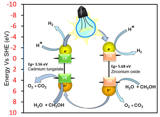 When visible light falls on such a heterojunction photocatalyst, a valence band (VB) e− can be excited from one of the units (either ZrO2 or CdWO4) and move to the conduction band (CB) of that unit, leading to the formation of h+ in VB. Due to the difference in the positions of the bands (VB and CB) in such units (ZrO2 and CdWO4) of the developed heterojunction, the possibility of migration of e− and h+ from one unit to the other unit may increase. This way, the excited e− and h+ do not go back and can rapidly and continuously transfer from one unit (ZrO2) to the other unit (CdWO4) of the semiconductor, thus causing charge separation, and also preventing charge recombination.