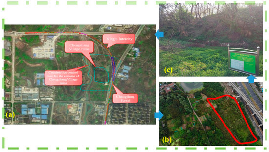 Plane figure of Chengshang Village ruins. (a) An aerial photograph captured by a drone; (b) A red line delineating the location of Chengshang Village; and (c) Chinese signage bearing the inscription “Chengshang Village Site Protection Notice”.