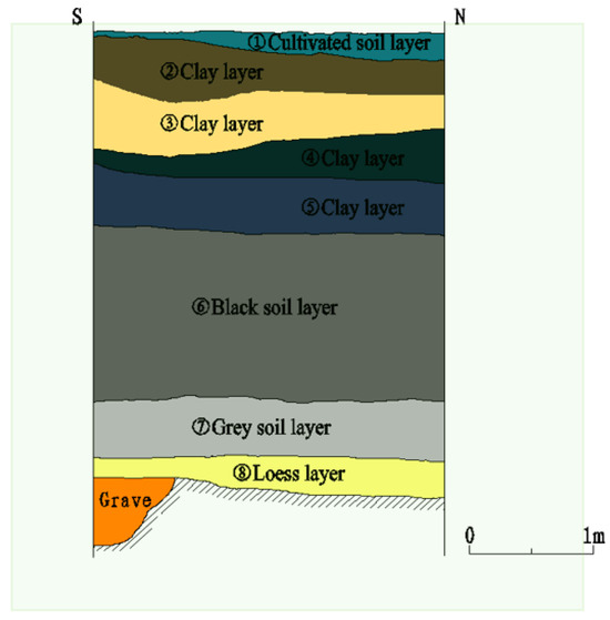 The cultural accumulation layer of Chengshang Village ruins is about 4 m thick, with an area of about 355 × 275 square meters, and is in a good state of preservation. More pottery pieces were excavated at the ruins, referring to the exploration data of the archaeological team; its stratigraphic accumulation is shown in Figure 2 and Table 1.