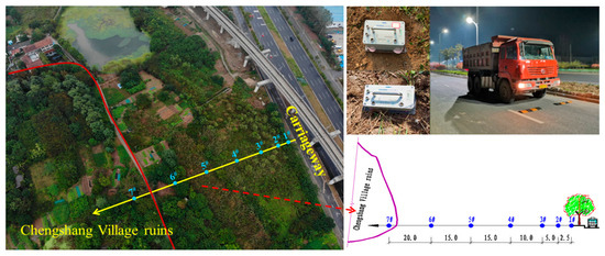 In order to study the vibration response and attenuation law of the ground and the ruins, combined with the specific conditions of the test site, seven positions were selected between the Chengshang Village ruins and the travel lane, and vibration monitoring points were arranged on the ground surface, and one horizontal pickup was installed at each measuring point, and its X direction was perpendicular to the direction of the travel lane. The distances from the monitoring points to the travel lane are 2.5, 5.0, 10, 20, 35, 50, and 70 m, respectively, and the plane locations of the monitoring points are shown in Figure 3.