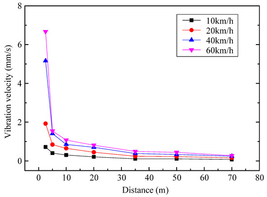 Figure 4 gives each measuring point’s horizontal vibration velocity curves at different travel speeds. As shown in Figure 4, the vibration intensity caused by road traffic gradually attenuates with the increased distance from the vibration source. The vibration velocity attenuates extremely quickly at close range and then tends to be flattened when the distance exceeds 20 m. The influence of travel speed is mainly reflected at close range, while the travel speed has little effect for long-distance vibration.