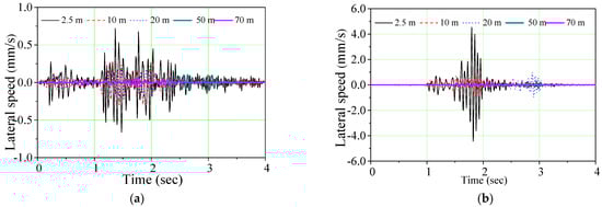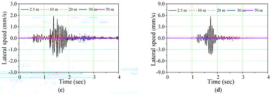As seen in Figure 5, for the same travel speed, the horizontal vibration velocity response decreases with the increase of the vibration source distance. In addition, due to the time-sensitive vibration propagation, there is an obvious “vibration hysteresis” phenomenon for long-distance vibration. Heavy vehicles should slow down as much as possible and keep away from cultural relics in actual projects.