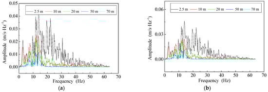 The horizontal vibration velocity spectra of monitoring points at different travel speeds are shown in Figure 6.
