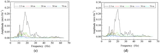 As can be seen from Figure 6, the excellent frequency band of the vibration velocity spectrum is distributed at 0~40 Hz. When the travel speed is low, there are two main frequencies near 10 Hz and 20 Hz. With the increase in travel speed, the vibration frequency band of 20 Hz is gradually significant. For the location far from the vibration source, the vibration intensity of each frequency decreases with the increase of distance, and the decay speed of high-frequency vibration is significantly higher than that of low-frequency vibration. The horizontal vibration velocity of the monitoring point is dominated by low-frequency vibration within 20 Hz.