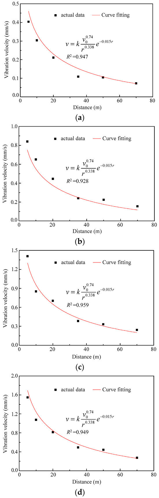 Based on previous research findings, it has been observed that the vibration velocity decreases exponentially as the distance from the vibration source increases [47]. Additionally, the vibration velocity increases as the vehicle speed increases, following a power function [48]. Therefore, a mathematical equation Equation (1) can be formulated to represent the relationship between vibration velocity and distance from the vibration source. Notably, the findings supporting Equation (1) have been validated by the author’s team in environmental vibration studies and analogous investigations.