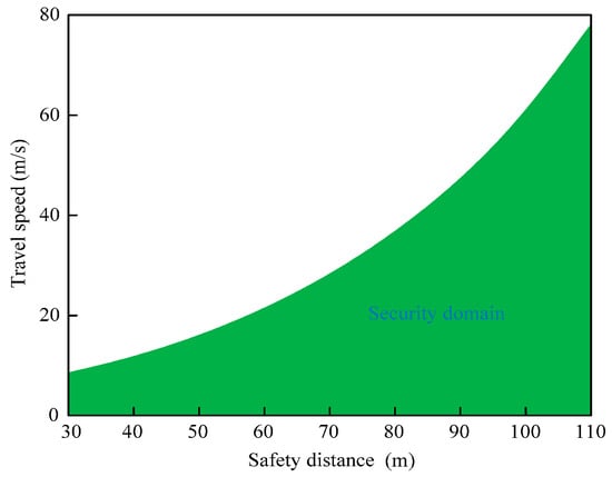 From the calculation results in Table 4, it can be seen that with the increase in travel speed, the safety distance also increases, and the safety distance is positively correlated with the travel speed. The safe area of cultural relics can be drawn by fitting curves, as shown in Figure 8.