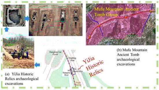 The author’s team is currently investigating the “Impact of road traffic-induced vibration on the neighboring underground sites” (illustrated in Figure 9), in addition to the cultural relics and sites of Chengshang Village. They are also involved in the following projects: The Nanjing Mufu Mountain Ancient Tomb Group is a nationally recognized cultural heritage site under protection. Mufu is a mountain range on the Yangtze River’s southern bank. It has served as a significant obstacle and strategic position in the northern outskirts of Nanjing since ancient times. Additionally, it has been a prominent region for burial sites since the Six Dynasties era (222–589 A.D.), which encompasses the six dynasties in the southern part of Chinese history from the Three Kingdoms to the Sui Dynasty. The YiJia Historic Relics, which spans around 1897 m2, is a Hushu cultural heritage site component.