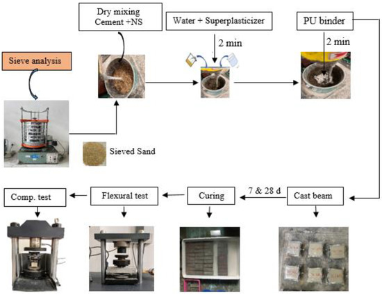 The mortar containing PU binder modified with NS were produced based on the following steps: firstly, the dry materials, which includes sand, cement, and NS were placed in an SJ-15 cement mortar mixer and mixed thoroughly for 1 min with a slow speed. Then, water containing superplasticizer was introduced to the dry mix and continued mixing for another 2 min. Subsequently, freshly prepared PU binders with various contents were introduced to the mortar mixes and we continued mixing until a homogeneous cement mortar mixture was achieved. Therefore, three specimens from each group were cast using prismatic specimens of a 40 40 160 mm3 mold to evaluate mechanical properties. After 24 h, the beam specimens were de-molded and kept in the standard curing room (temperature = 20 2 °C and relative humidity 99%) for 28 days before the testing. To achieve more reliable results, three samples from each PUCM sample were tested, and their average was measured as the test result. Figure 2 illustrates the systematic process of PUCM mixture and testing method.