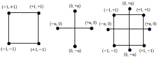 RSM is a mathematical method commonly used to evaluate and establish a model for a dataset containing independent and dependent variables. In addition, RSM has been applied in multi-objective optimization models that try to accomplish desired objectives according to either predicted or input parameters [47]. Many models can be employed in RSM modeling to establish statistical connections between independent variables and the target variable. These consist of the historical data model, Box–Behnken, central composite design (CCD) model, etc. The number of variables and degree of variability determine the model type for analysis [47]. If the relationship between the input parameter and output is uncertain, a linear function could be constructed using the first-order expression, as given in Equation (1). Figure 3 illustrates the CCD framework according to four points, displaying factorial points (±1) and four central points describing (±α) design points. The experimental dataset from thirteen (13) mixes was prepared with combination of three levels of variables (PU binder and NS) that were used to analyze the CCD model due to its flexibility for selecting α (distance from design center to axial run); α = 1 was implemented in this study [47]. According to Equations (1) and (2), the input parameters and output responses were statistically stated in a linear or polynomial form, respectively [47].