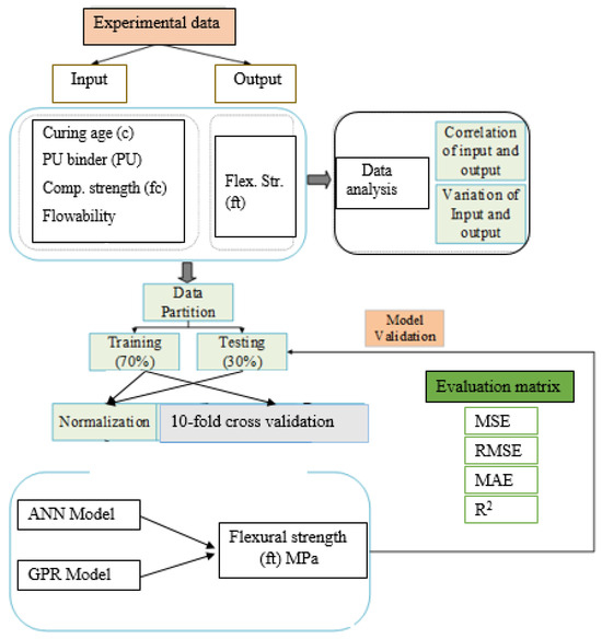 PU-cement mortar has been widely used as a repair material for civil engineering infrastructure such as concrete buildings and pavement. However, previous [6,26,42] studies have indicated that PU binder negatively affects cementitious material by reducing mechanical properties. On the other hand, nanosilica improves the mechanical properties of cementitious materials (mortar and ordinary concrete) by reducing pore structures, thus densifying the materials, which leads to the improvement in mechanical properties [43,44], was incorporated into the PU–cement mortar in this study, targeting the mitigation of the negative effect PU binder in the mortar. Therefore, the main aim of this study was to comprehensively evaluate the mechanical properties of PU–cement mortar incorporated with nanosilica. The RSM/CCD model was employed to optimize mortar mixtures and evaluate the mechanical properties. On the other hand, machine learning (ML) algorithms Such as ANN and GPR were used to predict the flexural strength. The prediction skill of ML algorithms was then compared with the RSM model.