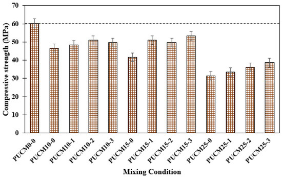 - The mechanical properties of PUCM remarkably decreased with increases in PU binder content, more pronounced in the compressive strength values. However, some part of the lost strength was mitigated due to the reinforcing effect of NS particles. The compressive strength of the PUCM25-0 specimen was 31.34 MPa, which appeared to be the lowest strength among all the mixes.