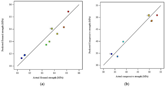 Relationship between actual and predicted values using CCD/RSM model for (a) flexural strength and (b) compressive strength.