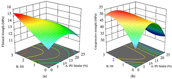 Three-dimensional plots for the simultaneous effect of PU binder and NS in the PUCM for: (a) Flexural strength and (b) compressive strength.