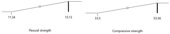 The statistical indicators utilized to evaluate the performance of the developed models are summarized in Table 7, which is sufficient to assess the model’s effectiveness in evaluating the responses and reflecting the goodness-of-fit criteria. The proposed model achieved the model’s precision level with statistical indicators. The outcome revealed that the CCD/RSM model is capable of handling models with a large number of free features, and the mechanical strength was estimated with high accuracy (refer to Table 7); the corresponding scatter plots are shown in Figure 9. The responses (flexural and compressive strength) were estimated with high accuracy. Additionally, the compressive strength model showed the highest performance with a value R2 = 0.9469. The standard deviation values can be considered when evaluating the models’ performance concerning datasets obtained from experimental studies. The models’ mean values were compared to standard deviation values to determine how accurately the data fit the developed models. Furthermore, adequate precision (AP) value was needed with the appropriate signal as achieved from the developed model were greater than 4. As a result, the established models might be used to explore the design space as specified in CCD [57]. Moreover, the model’s performance was assessed using the coefficient of variation, which reflects the scattering of the data. The models’ COV results of 4.87% and 5.75% demonstrated that the scattering in the dataset is insignificant.
