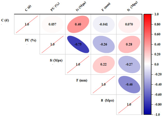 Many studies have popularly used the sensitivity analysis of datasets to treat the inappropriate potential input variable in the modeling task, because utilizing the irrelevant variable in the AI-based model reduces the accuracy of the prediction model and increases the computational demand [58]. Therefore, the Pearson correlation matrix was used in this study to determine the most sensitive variables from the experimental datasets, as depicted in Figure 13. The parameter relevance decreases as it become closer to zero and increases to unity (−1 or +1). The unity values translate the perfect variable. The +ve and −ve values demonstrate a direct and inverse relationship between the independent and dependent parameters. As shown in Figure 14, most input parameters showed a low correlation value with the target parameter. Moreover, an inverse relationship existed between flowability and target parameter, and compressive strength appeared to be the most sensitive parameter for predicting the flexural of the PU–cement mortar with a PC value of 4. The low correlation value between all input and target parameters is attributed to the abnormal distribution of the datasets. The descriptive statistical feature of the input and output parameters are summarized in Table 10.